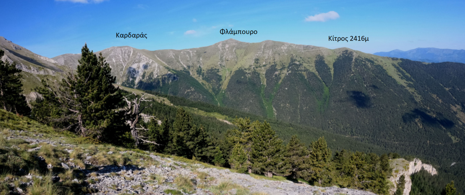 Ο Άκις μας λέει ότι πρέπει να συνεχίσουμε, έχουμε ακόμη δρόμο. Πίνουμε τρεις γουλιές νερό, τρώμε μισή μπάρα δημητριακών, παίρνουμε μια ανάσα και κινούμαστε σε φαρδύ λαιμό, με ήπια κλίση, ανάμεσα στα Μικρά και Μεγάλα Καζάνια. Δεξιά μας βλέπουμε τις πλαγιές του Καρδαρά, του Φλάμπουρου και του Κίτρου (κορυφές στα 2470μ) να κατεβαίνουν ολοπράσινες προς την παγετωνική ρεματιά του Ξερολακίου.